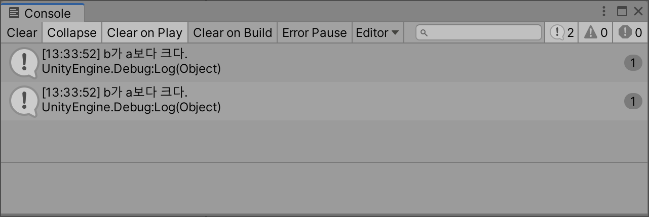 Debug.Log("b가 a보다 크다.");